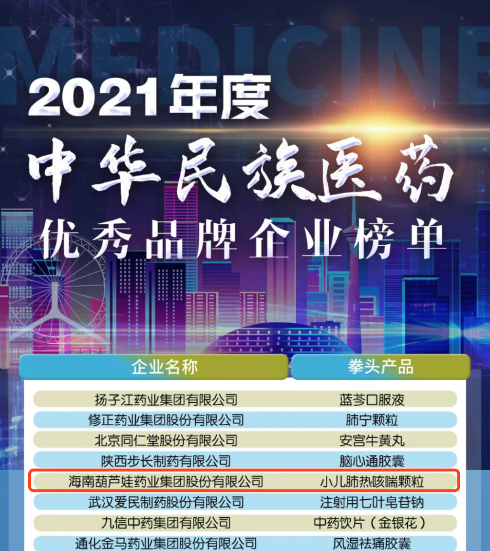 12月29日,全国工商联医药业商会发布了“2021年度中华民族医药优秀品牌企业榜单”,PA视讯药业集团凭借黄金单品小儿肺热咳喘颗粒(4克)实力登榜。